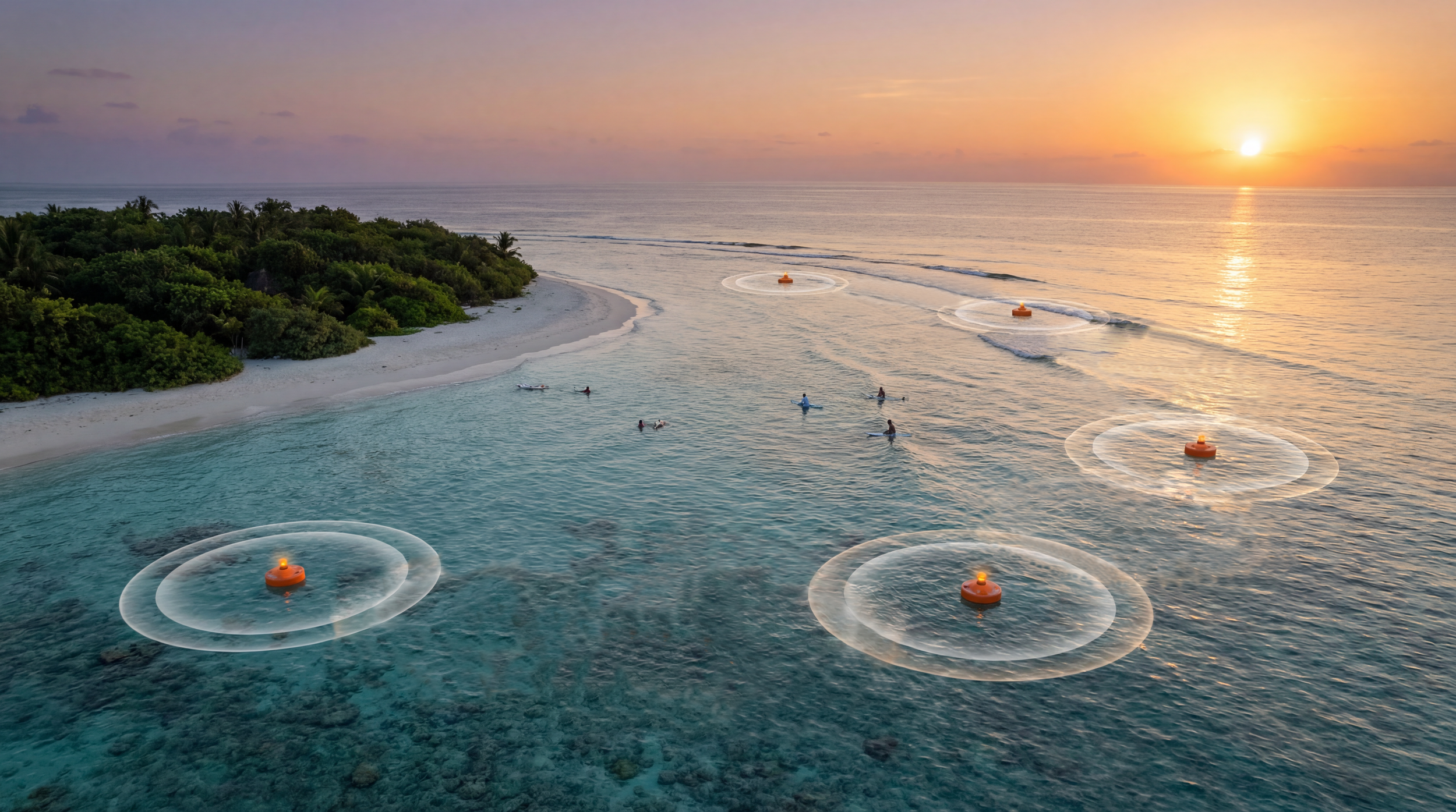 Each buoy operates as an independent detection node secured to its anchor station. Multiple nodes form an offshore sensing array with overlapping detection zones that continuously monitor activity within the protected swim corridor.